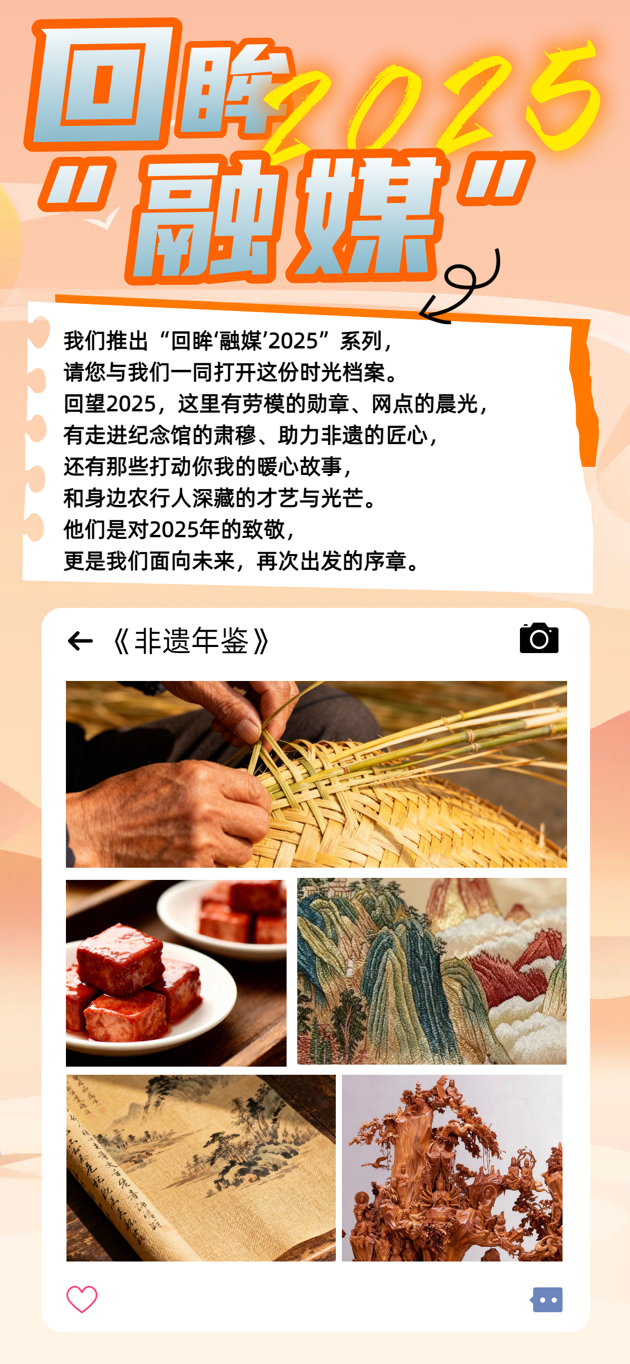 2025年,“农银融媒”App《让非遗焕发时代光彩》栏目,循着匠人的足迹,进行了一场跨越山河的文化寻访。我们记录了19项国家级与省级非遗,试图用笔与镜头,解读泥、木、铁、布之中所蕴藏的东方智慧与生活美学。我们特制作一组《非遗年鉴》海报,为您烹制一份年度文化回顾。这不仅是成果的展示,更是一次温故知新的邀约——邀您一同看见,传统如何在与时代的对话中,焕发出令人心动的光彩。
