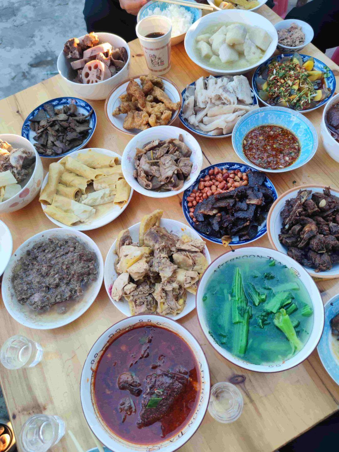 瞧,那一盆色泽诱人的红烧肉,肥瘦相间、软糯不腻;现焯的血旺嫩滑爽口、鲜气扑鼻;还有喷香的粉蒸肉、酸辣开胃的凉拌猪头肉……道道都是家乡味,样样都是岁月情。大家围坐圆桌,举筷畅谈,碰杯声、笑语声、锅勺声交织在一起,宛如一曲鲜活欢腾的乡村乐章。