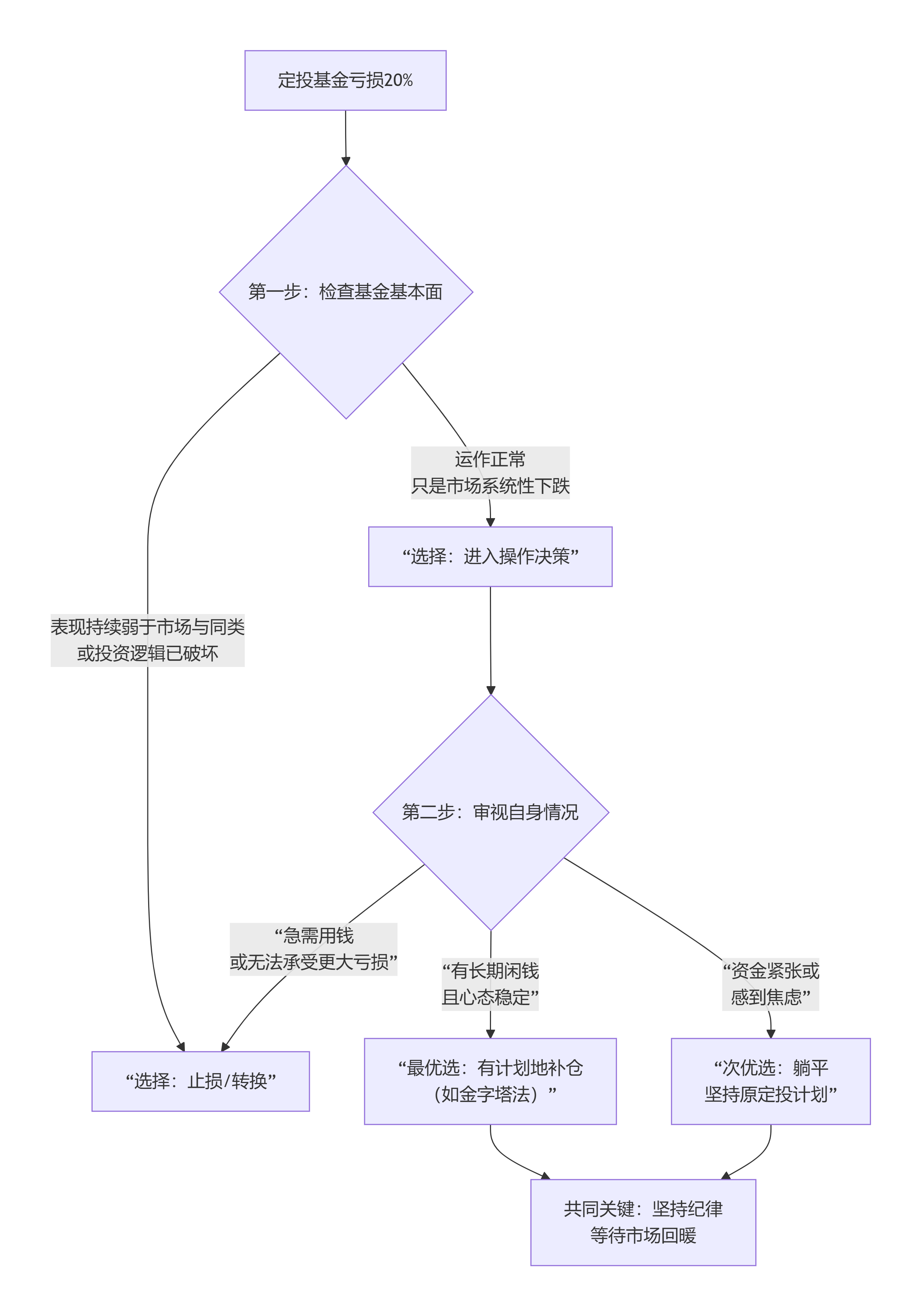 核心策略排序通常是:有条件就优先考虑【补仓】,其次是【躺平】坚持原计划,最后才是【止损】。下图清晰地展示了完整的决策路径: