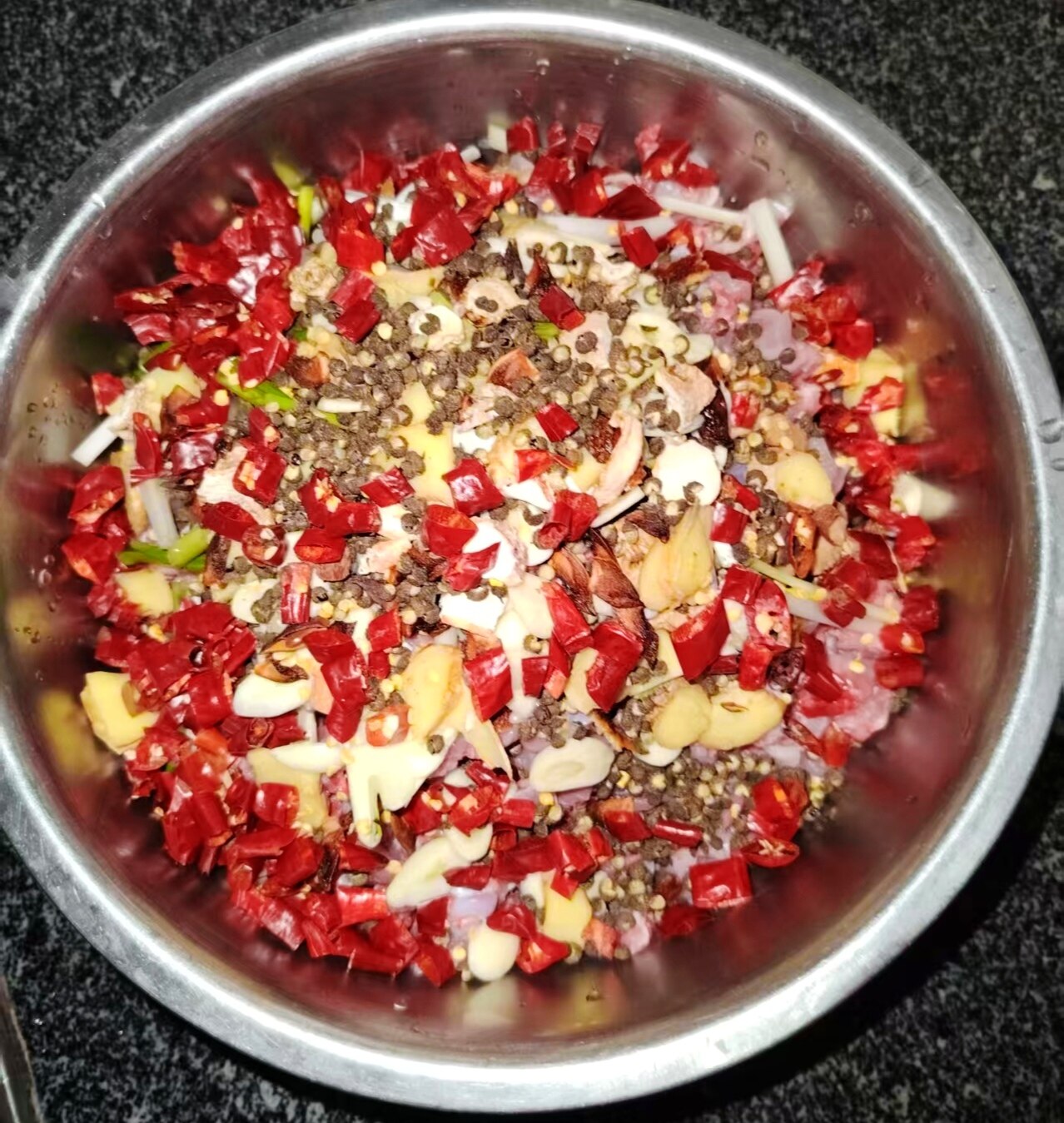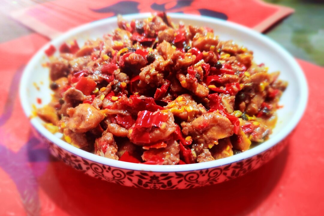 这时候,屋里的孩子们也会围拢过来,端着小板凳坐成一圈,加入到美食的准备中。他们左手紧握辣椒把,右手举起大剪刀,“咔嚓”一声,辣椒段带着籽儿欢快地落入不锈钢盆里。一边剪,一边先抓少许干辣椒圈放入兔丁中一同腌制。
