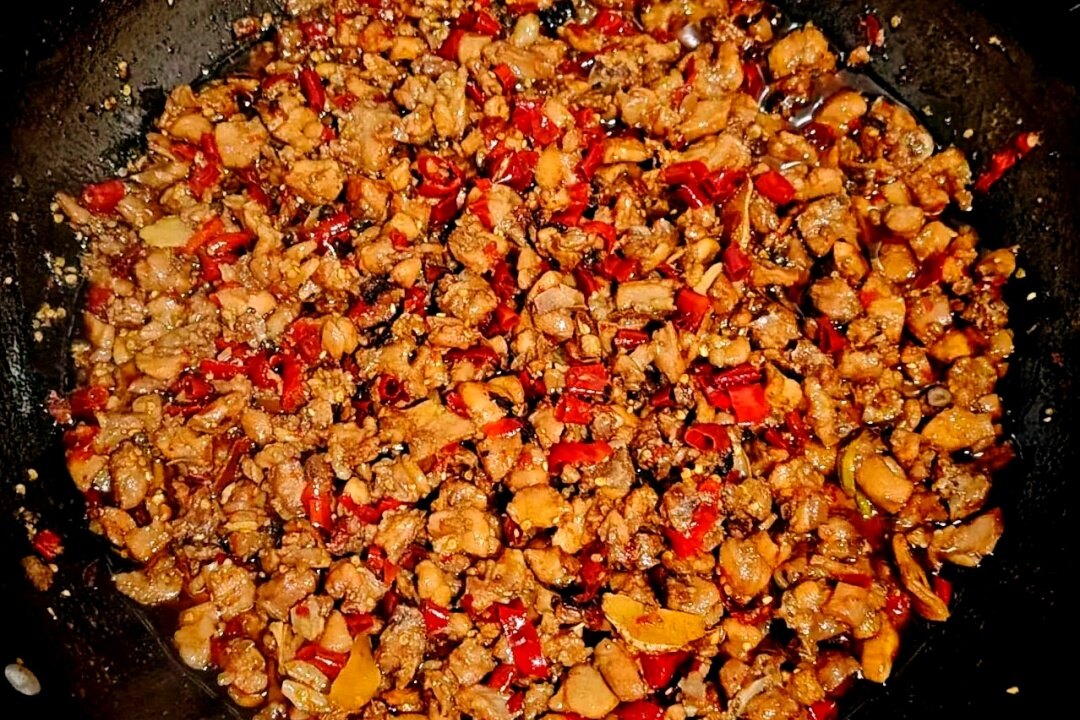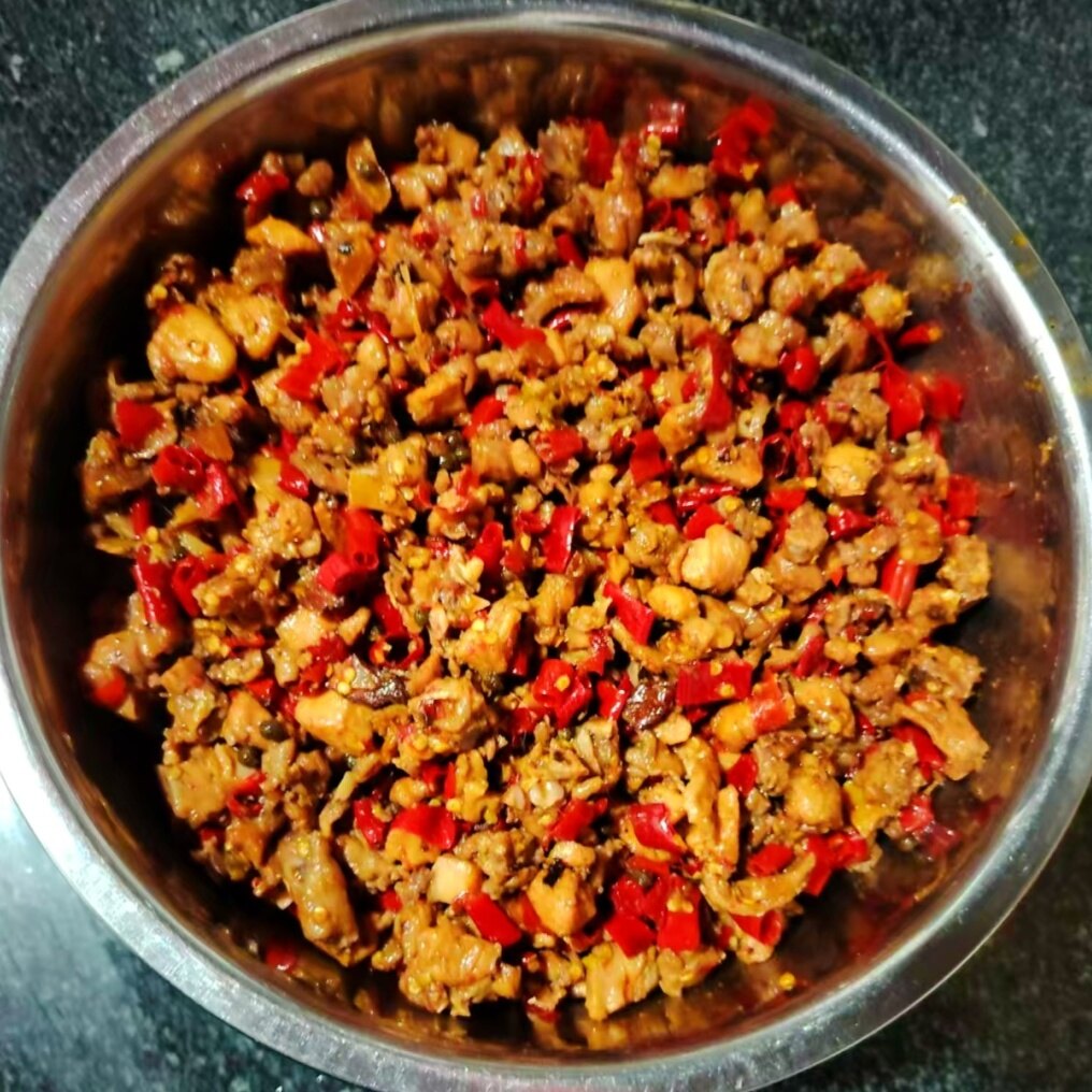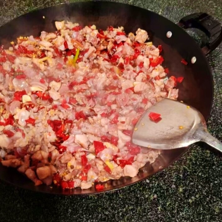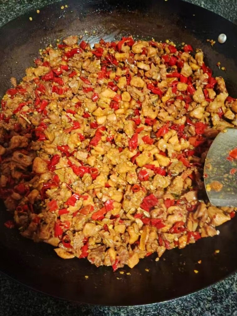 随着兔肉不断翻炒,油色渐渐恢复清亮,这时便将剪好的大量辣椒圈,以及少许陈皮丝等依次放入锅中,继续小火慢炒。辣椒与兔肉在锅中碰撞交融,香气愈发扑鼻。