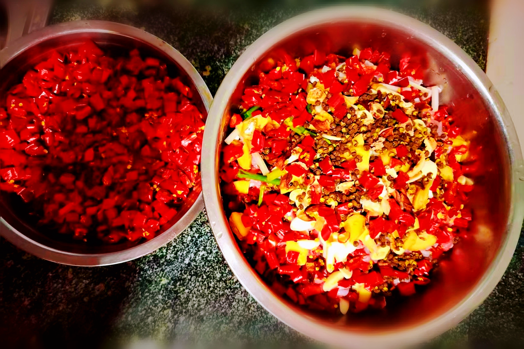 等待腌制的间隙,便可准备“冷吃兔”的灵魂配料——干辣椒。选用川渝地区的红色朝天椒,粗细如无名指,身形修长,表皮泛着诱人的红亮光泽。这些辣椒经过晾晒,变得又干又脆。人们拿起剪刀,将其剪成指甲盖大小的辣椒圈。