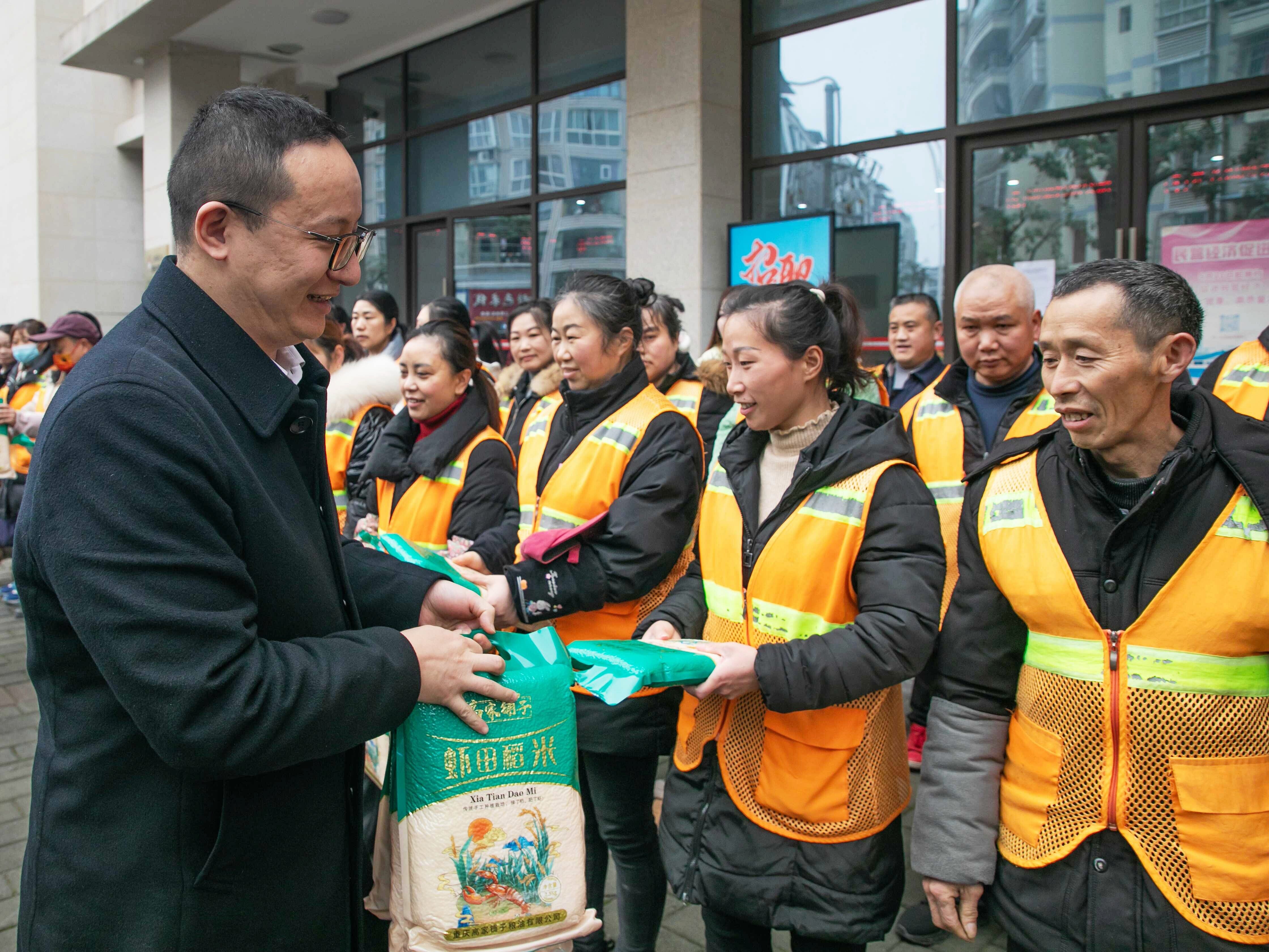 ● 2月10日,农行重庆铜梁支行在铜梁区巴川街道开展“迎新春 送温暖”慰问活动,为环卫工人送上节日祝福与爱心物资。(潘钰琳)