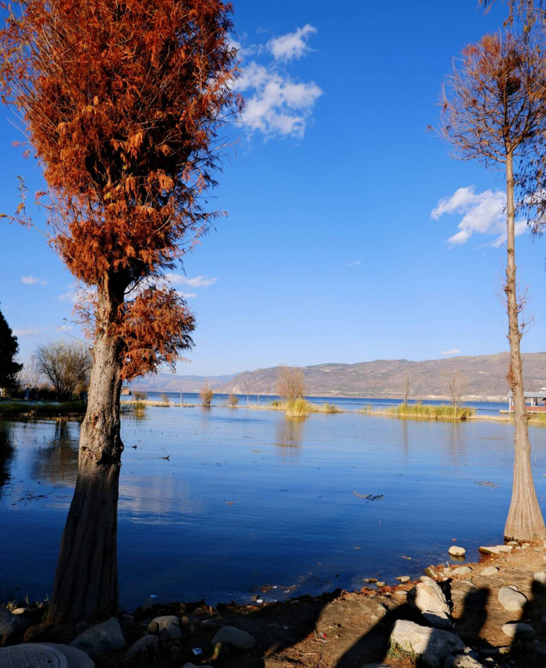 初见洱海,是在才村:水杉静静立在浅水中,褐黄的树枝倒映在碧蓝的湖面上,像一幅徐徐展开的水墨画。沿湖而行,微风拂面,带着一丝清凉。环海路边,芦苇摇曳,白墙青瓦的民居散落其间,远处苍山覆雪,云絮在山巅缓缓游移——随手一拍,皆是无需滤镜的风景。