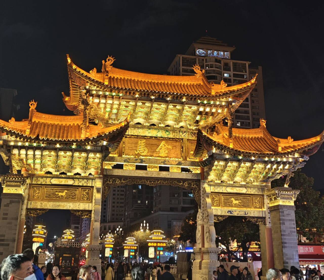 夜色降临,昆明藏在金马碧鸡坊的灯火里。古牌坊被暖黄的灯光勾勒出飞檐翘角,街边烤乳扇的奶香随风飘散。坐落于市区的马家大院,是昆明现存保护最完整的“四合五天井”式白族民居经典建筑。砖纹里浸着岁月,指尖抚过斑驳的门柱,仿佛能听见老昆明的故事在低语。