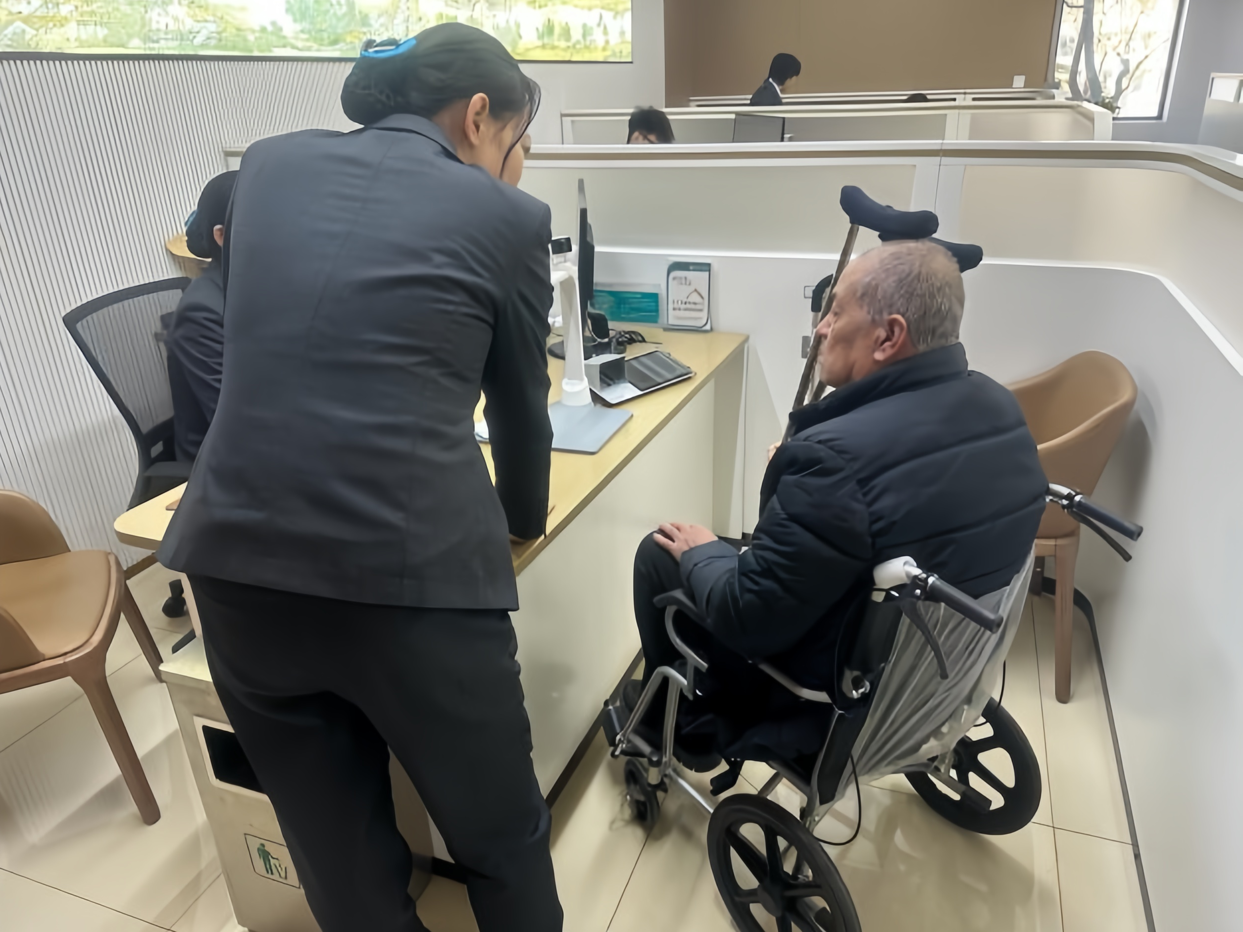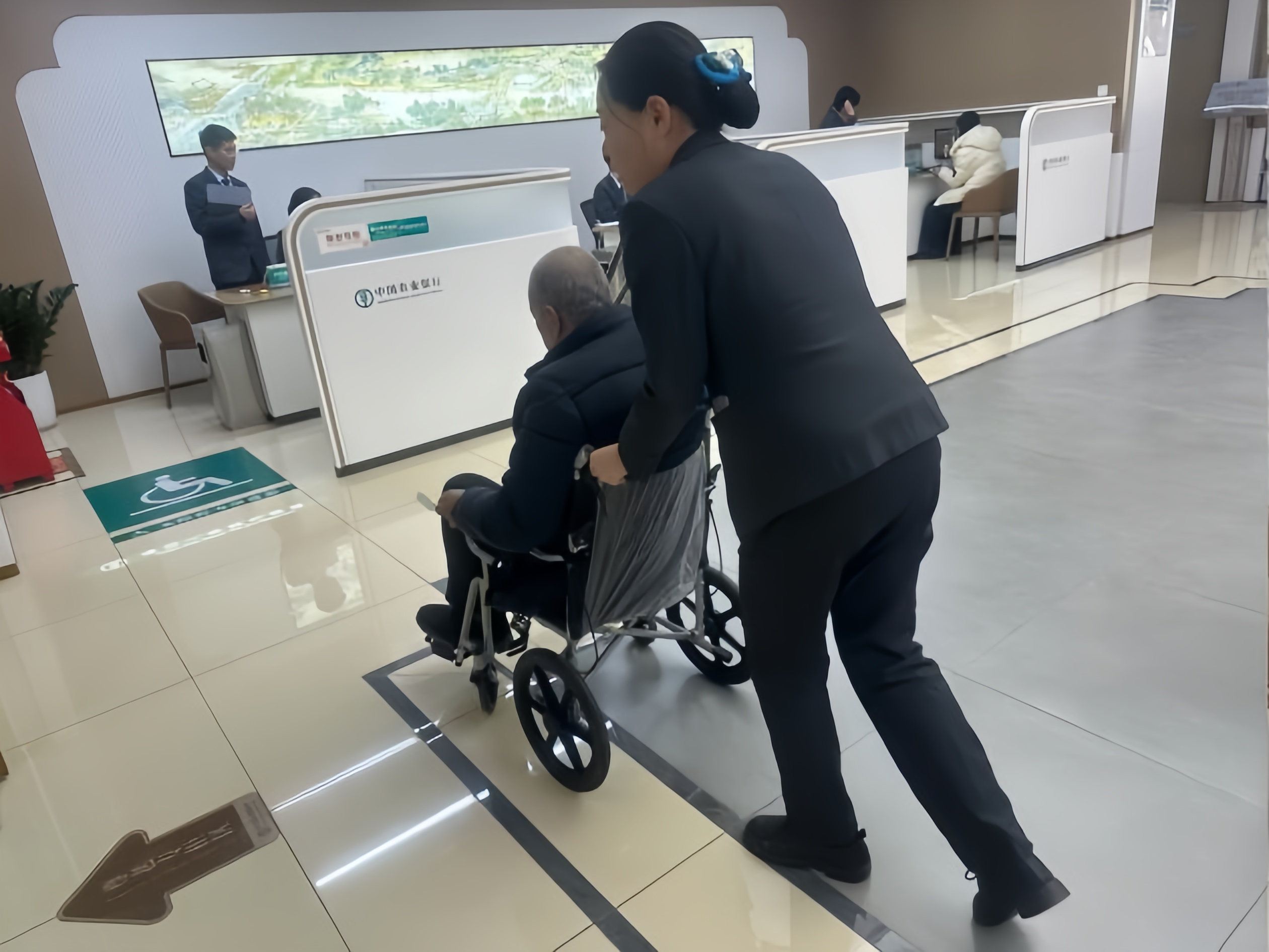 ● 近日,一位老大爷拄着拐杖走进农行山东潍坊青州支行。大堂经理见状,从便民服务角推来轮椅,搀扶老人坐稳后,全程陪同完成业务办理。临走前,工作人员留下网点服务电话,告知其可享受上门服务便民政策。(吕圳昌 左斌)