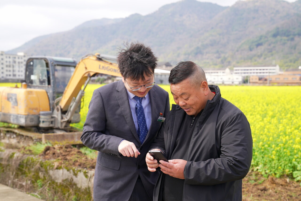 农行浙江瑞安支行客户经理回访浙江省农行系统首笔惠农网贷“三位一体贷”用户——种粮大户张叔,并协助他使用手机银行。(吴亮璇 摄)