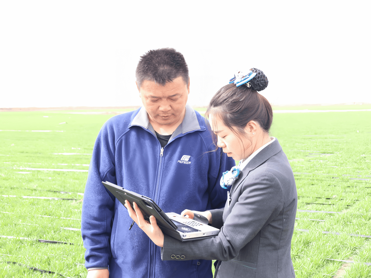 农行新疆伊犁分行客户经理把服务窗口“搬”到种植户身边,让春耕资金一步到位。(马智斌 摄)