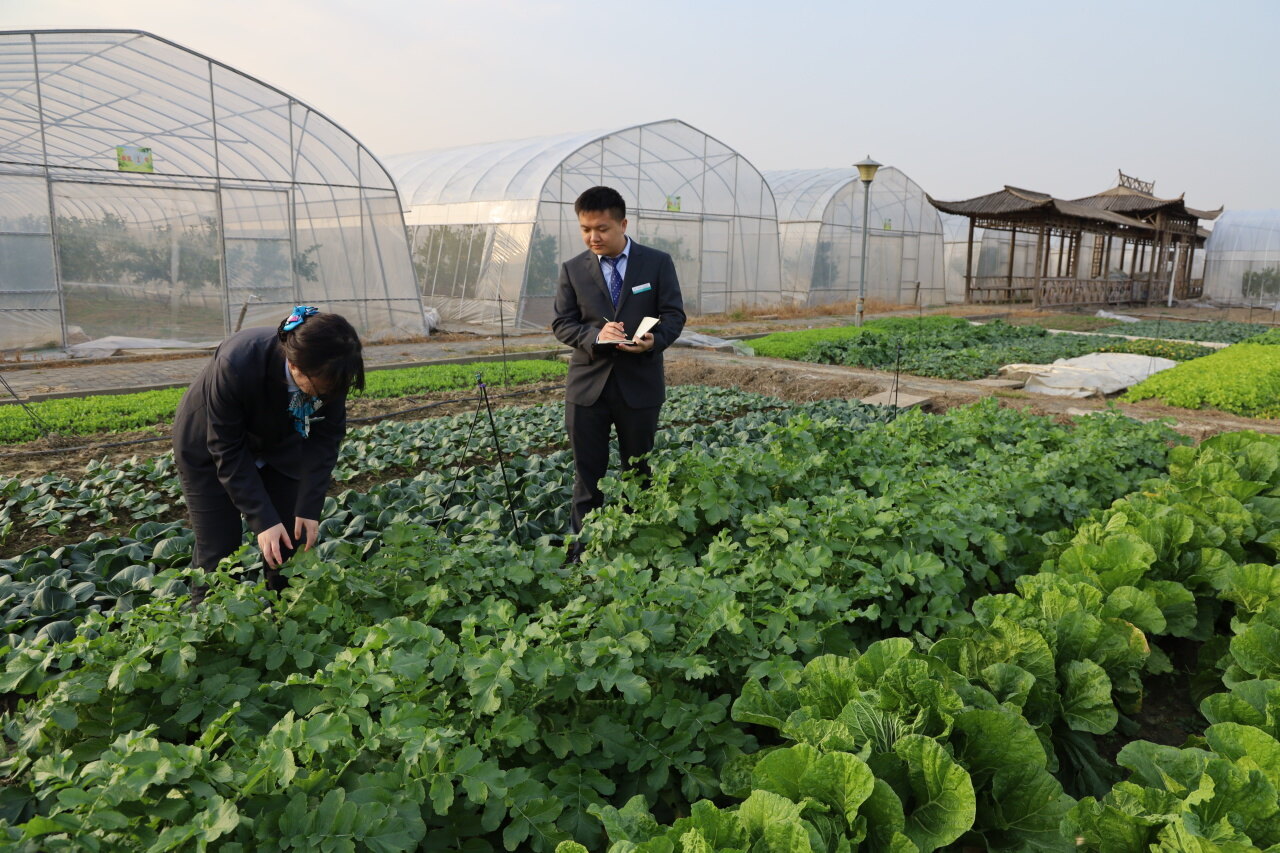 农行江苏丹阳支行客户经理来到大圣村的幸福农场,现场了解蔬菜种植情况。(华元成 摄)