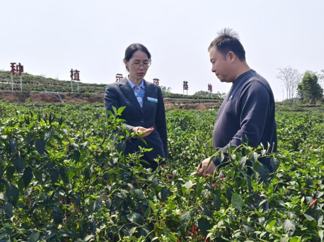 农行广西玉林兴业县支行“服务乡村振兴党员先锋队”走访当地辣椒种植示范基地,为种植户办理“惠农e贷”。(胡钰 摄)