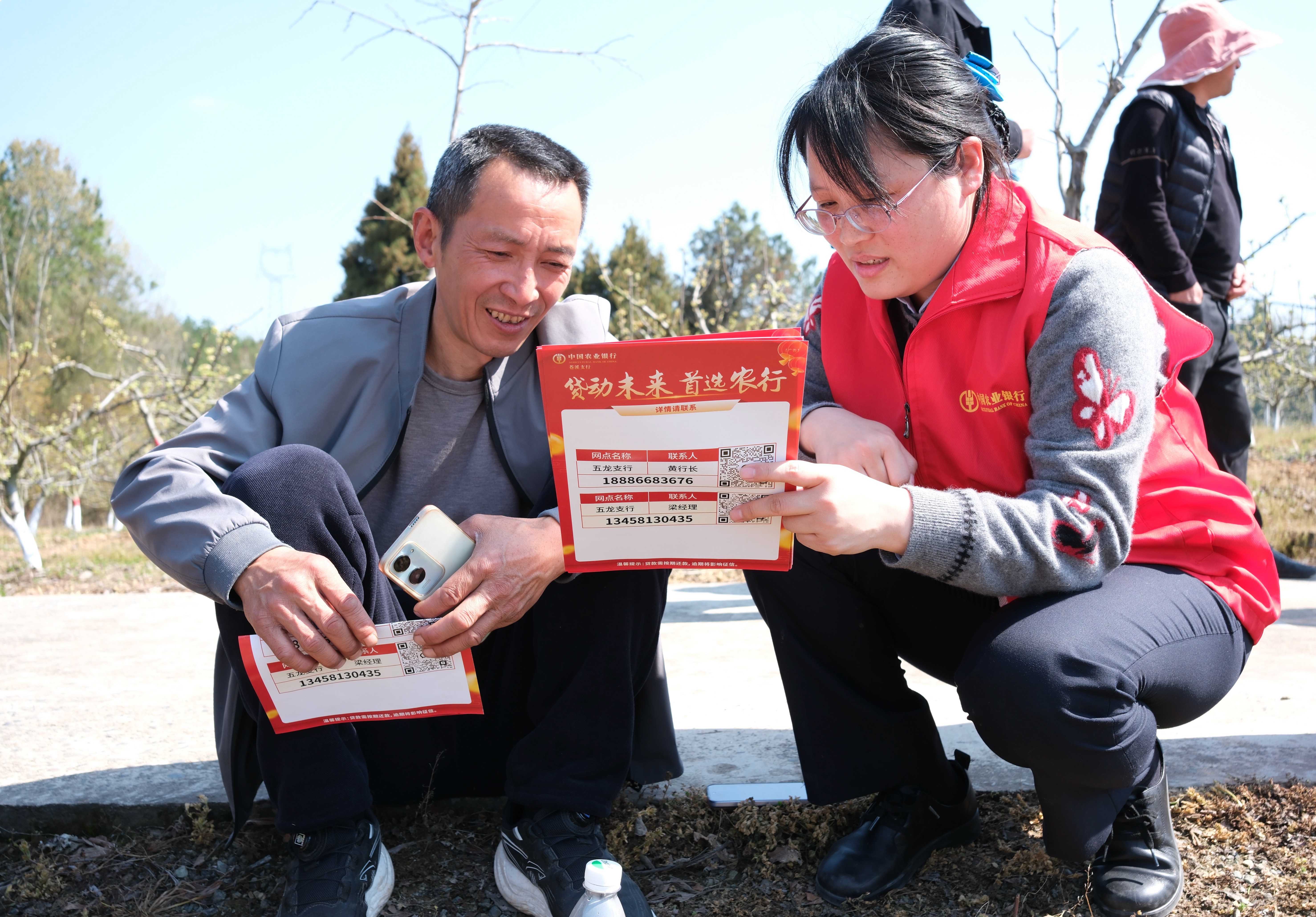 农行四川苍溪支行客户经理在五龙镇的田坎上开设“流动讲堂”,宣讲春耕贷款政策。(张键群 摄)