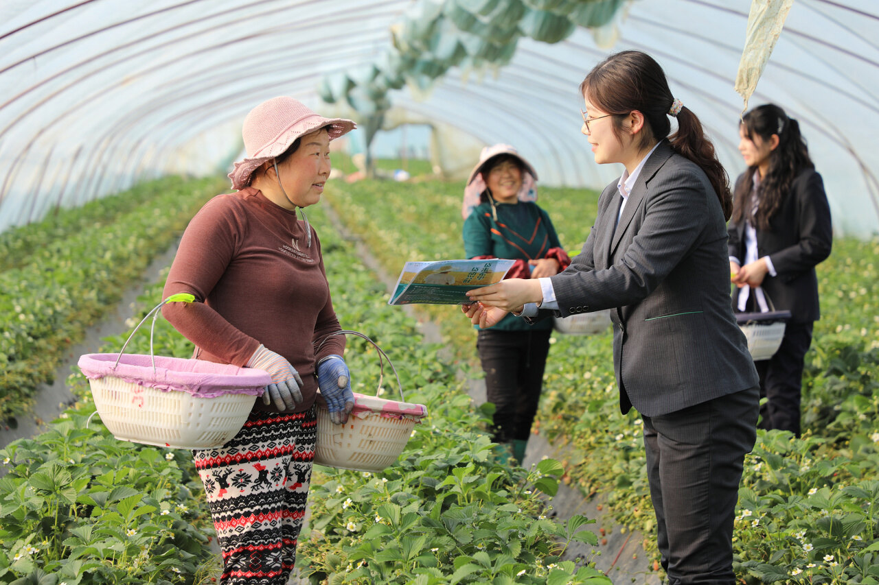 农行安徽淮南龙湖支行员工走进当地草莓种植大棚,向种植户推介“惠农e贷”。(宫传奇 摄)