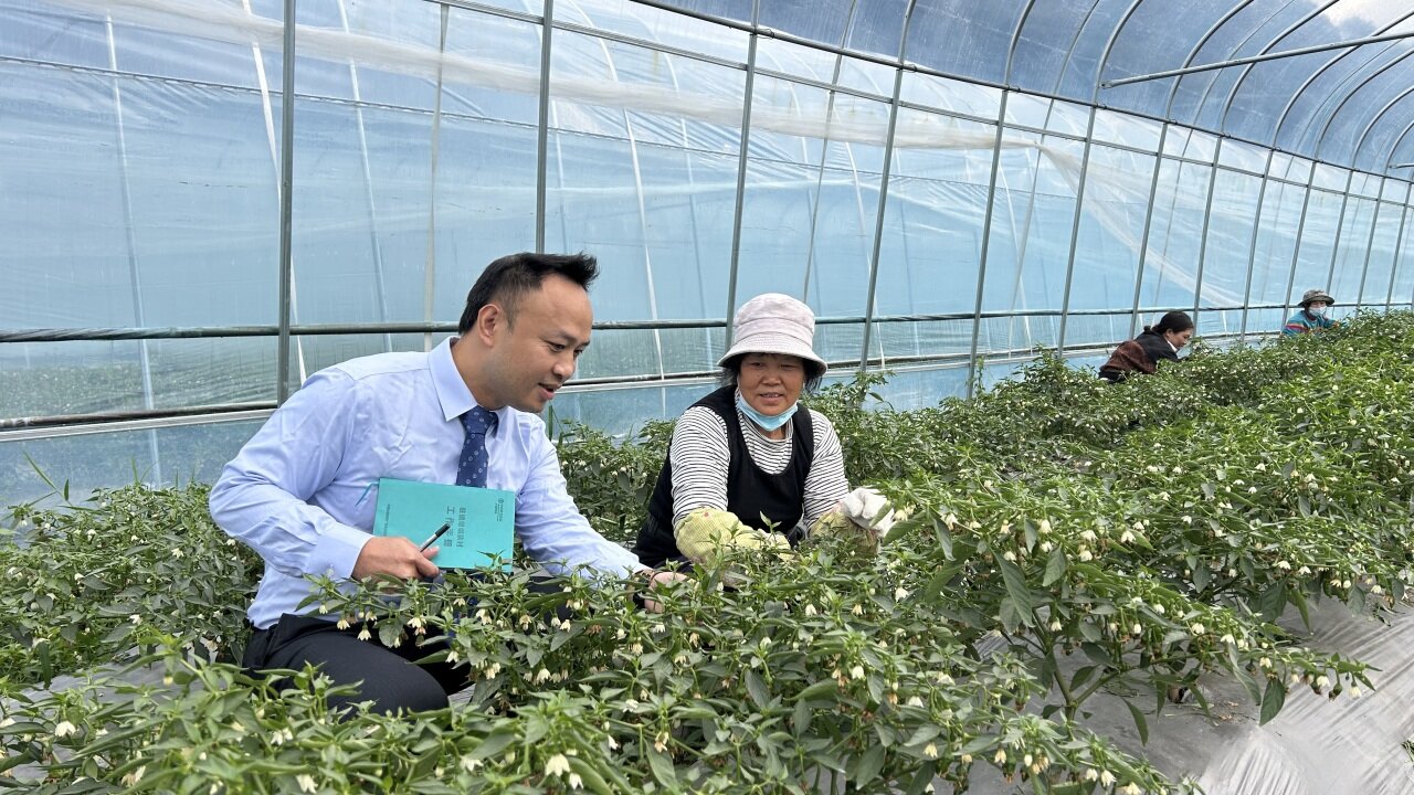 农行广东南海西樵支行客户经理钻进蔬菜大棚,一边看长势,一边记需求,把资金服务送进了农户心坎里。(梁绍标 摄)