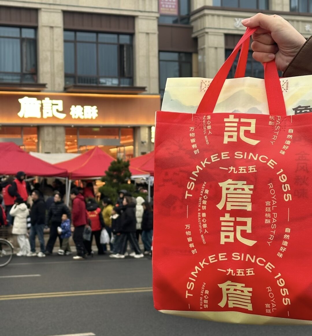 ▲游客买到詹记桃酥后拍照留念。