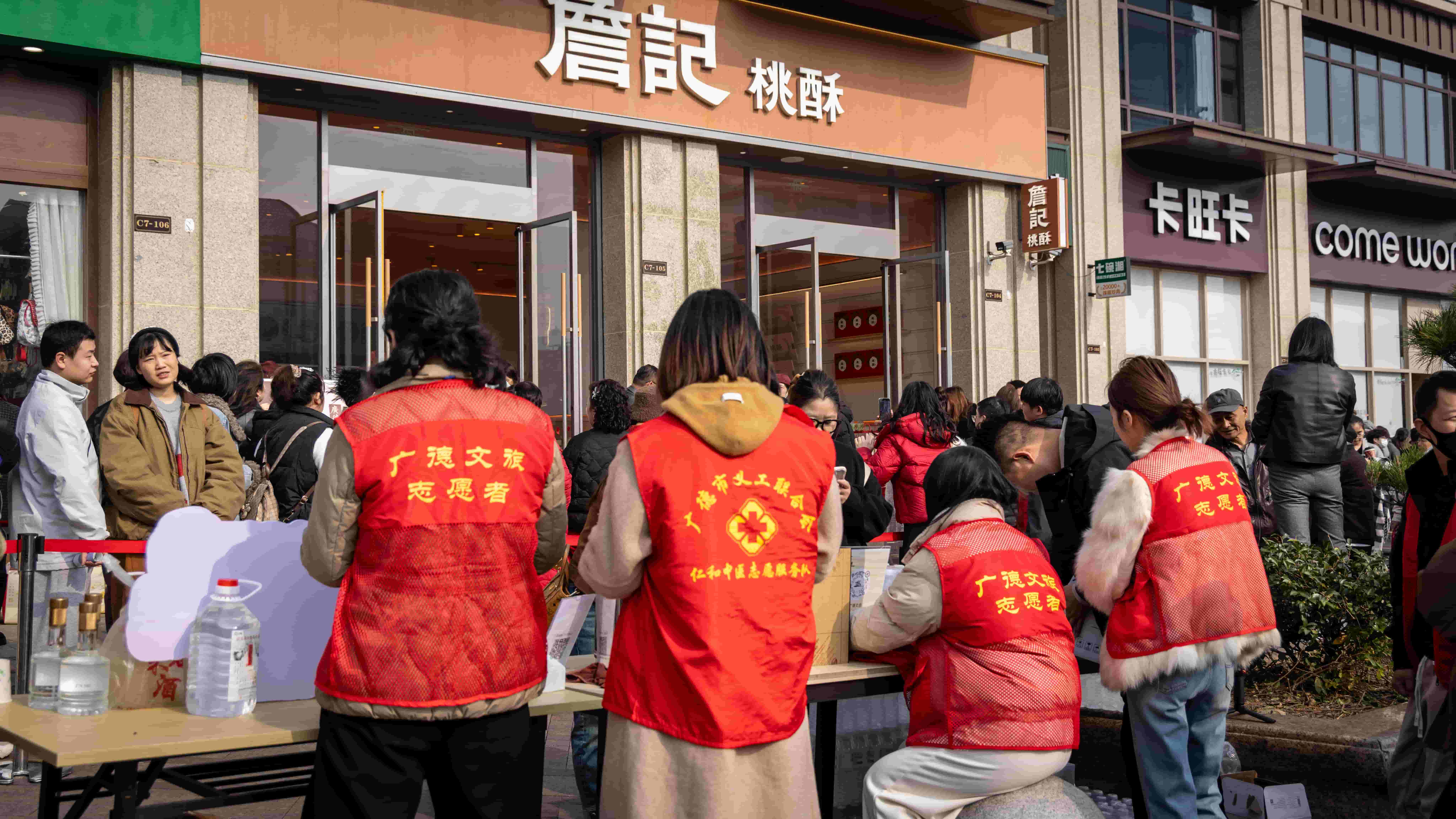 ▲广德文旅志愿者在詹记桃酥店外提供志愿服务。