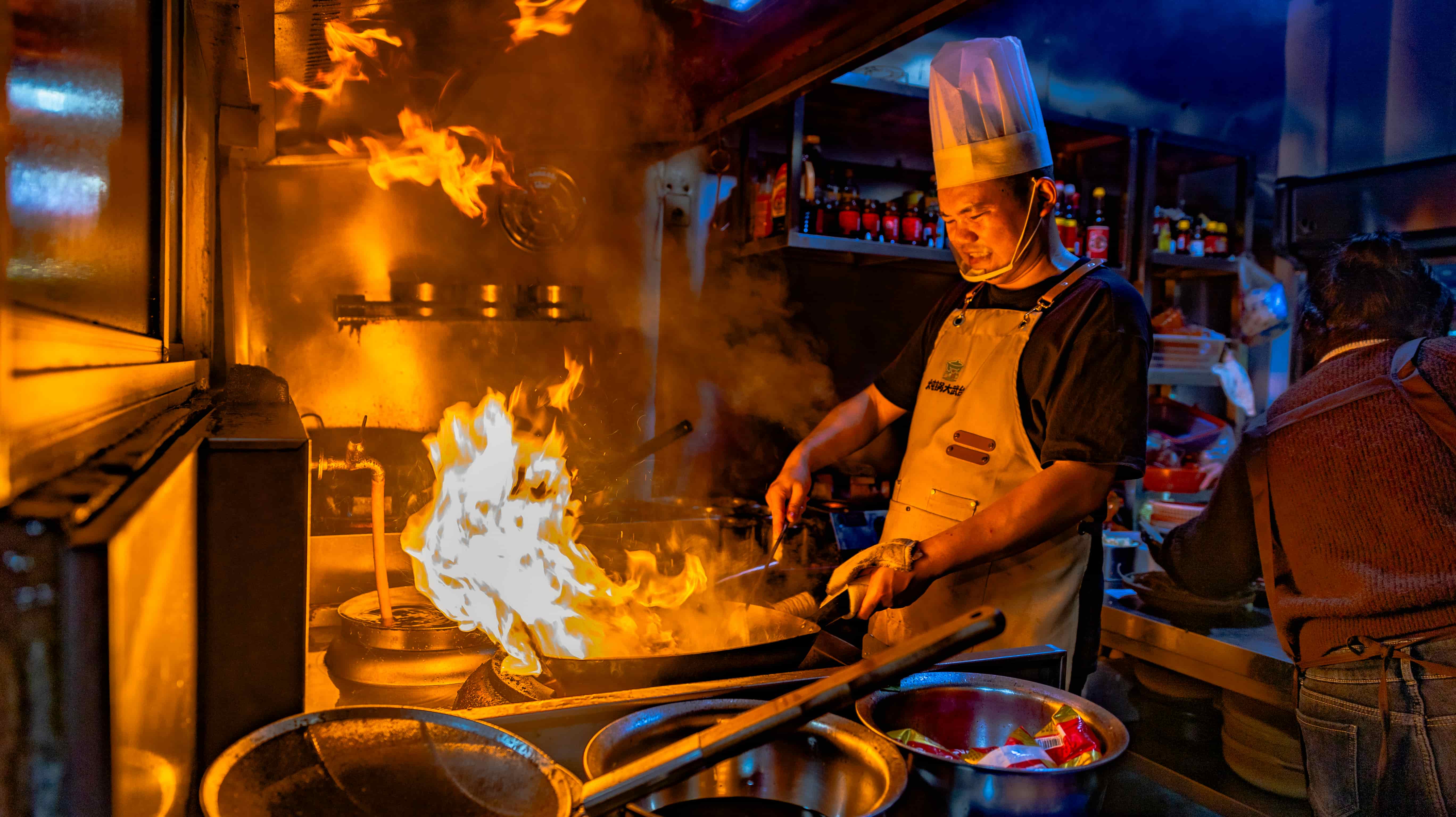 ▲师傅在后厨翻炒食材。
