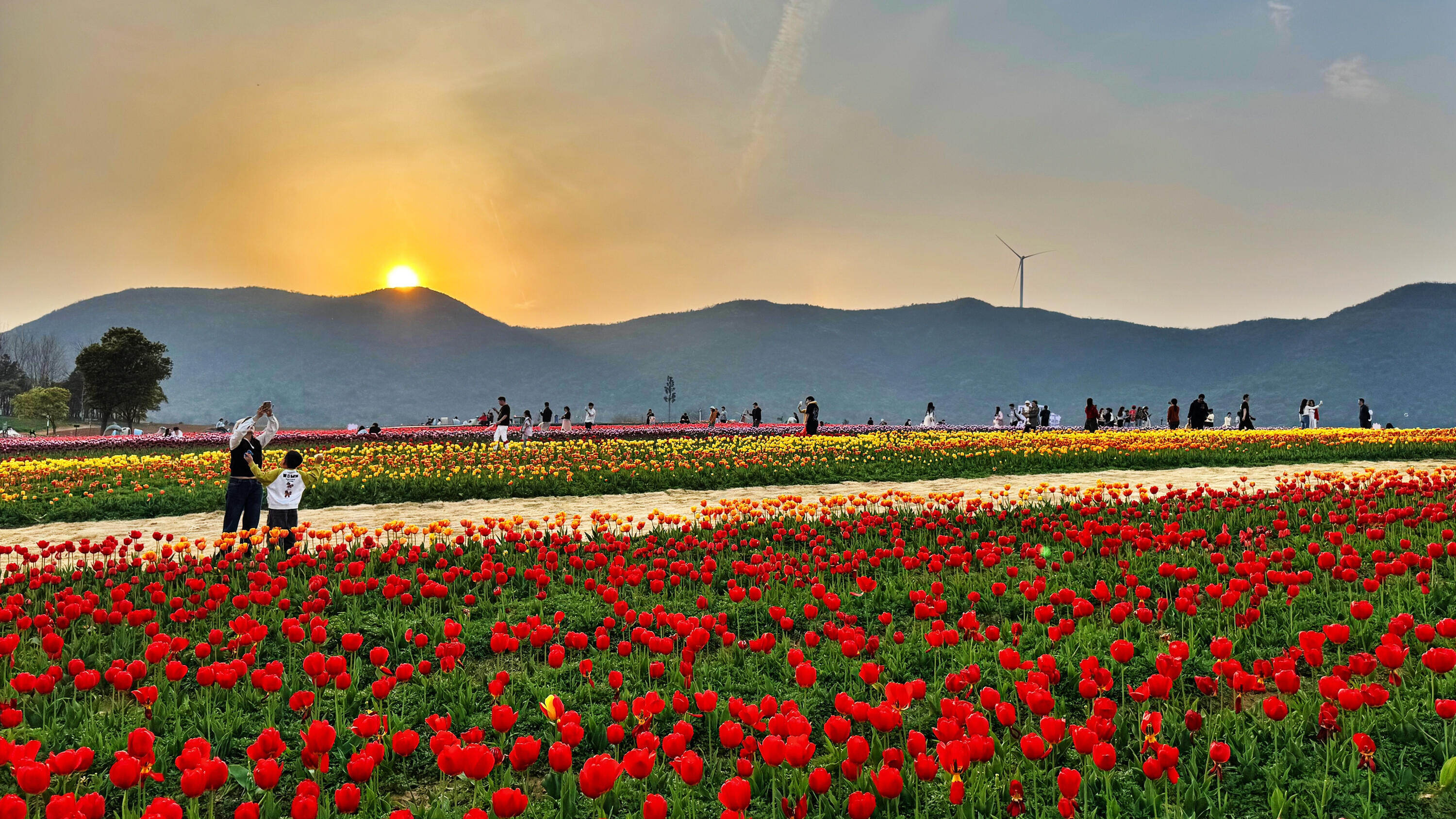 安徽省巢湖市“半汤郁金香高地”景区已进入最佳盛花期,落日与花海相拥,邀您共赴一场春日的浪漫之约。