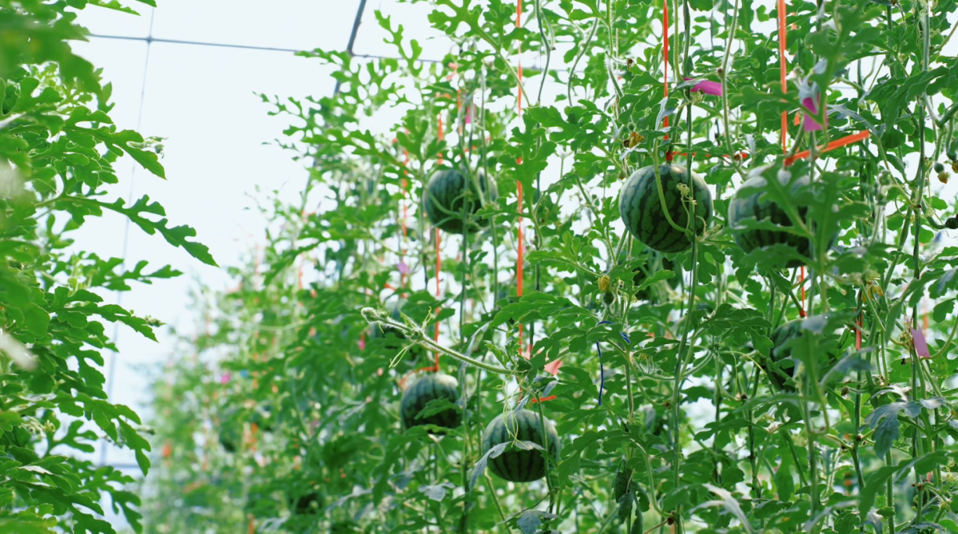 走进他的大棚,一排排藤蔓整齐挂在吊架上。每个西瓜悬在半空,能360度接受光照,果形圆润,品质均匀。